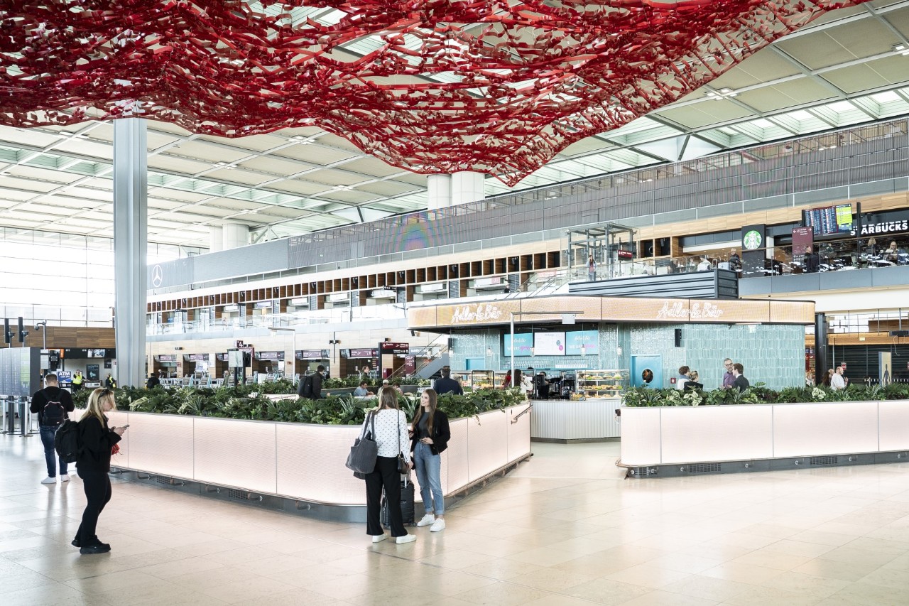 The open-plan bar has around 70 seats and is centrally located in the check-in hall of Terminal 1 – directly below the artwork ‘THE Magic Carpet’ by Californian artist Pae White. The menu includes breakfast options such as ‘Hauptstadt-Müsli’ (capital city muesli) and a vegetarian ‘Berlin-Club Stulle’ (Berlin club sandwich), as well as regional classics such as Berlin currywurst and Lausitz potatoes with linseed oil. The menu is complemented by a wide selection of drinks.